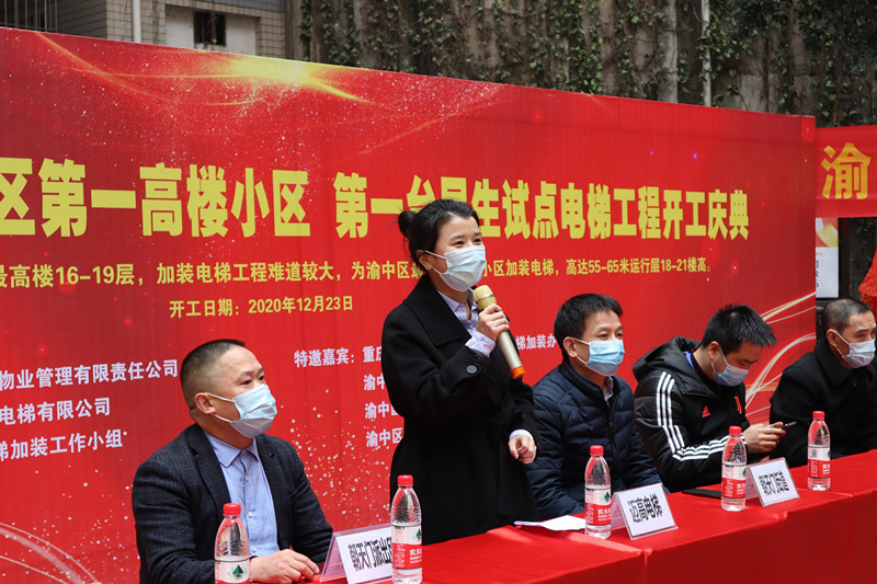 重庆迈高电梯有限公司执行副总许丽出席并为开工仪式致辞,她表示“都市庭园小区不仅作为渝中区旧楼加装电梯中楼层数最高的老旧小区,在重庆乃至全国范围内也较少有如此高楼层的电梯加装。楼层高意味着居民多我们的责任就更大。迈高一定不负重托,必将保质量、保工期把都市庭园小区旧楼加装工程做成样板项目、明星项目。 让业主在2021年乘坐上安全、可靠的电梯回家,彻底告别“爬楼”的苦恼。”
