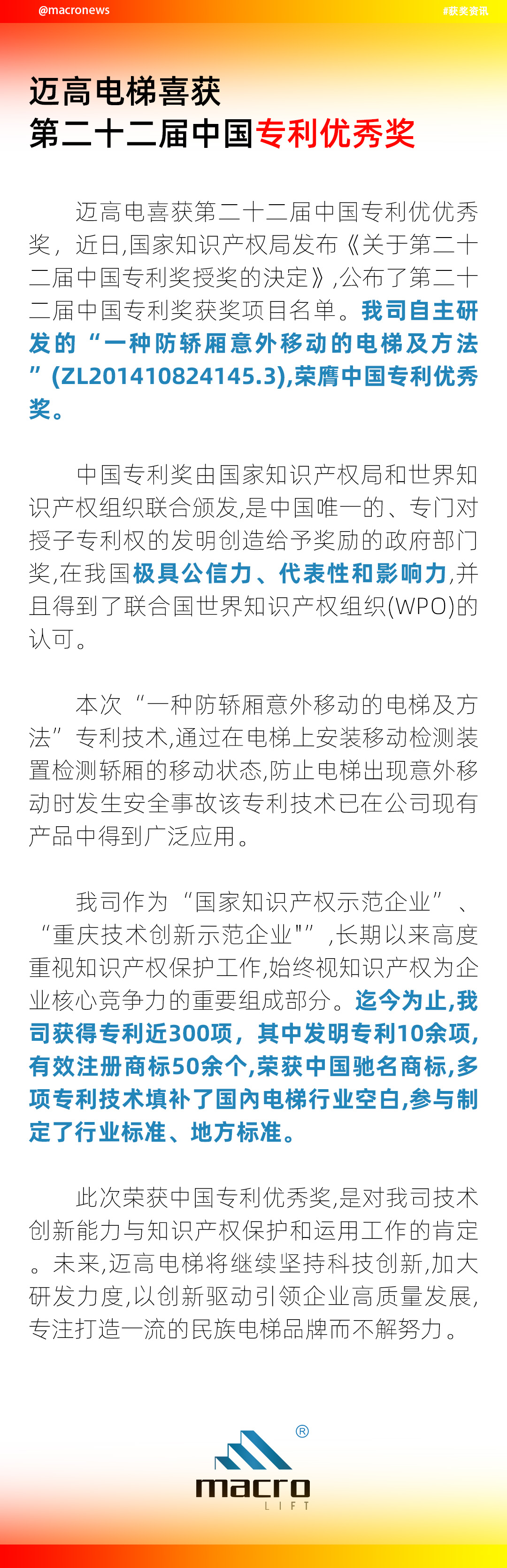 ,国家知识产权局发布《关于第二十二届中国专利奖授奖的決定》,公布了第二十二届中国专利奖获奖项目名单。我司自主研发的“一种防轿厢意外移动的电梯及方法”(ZL201410824145.3),荣膺中国专利优秀奖。