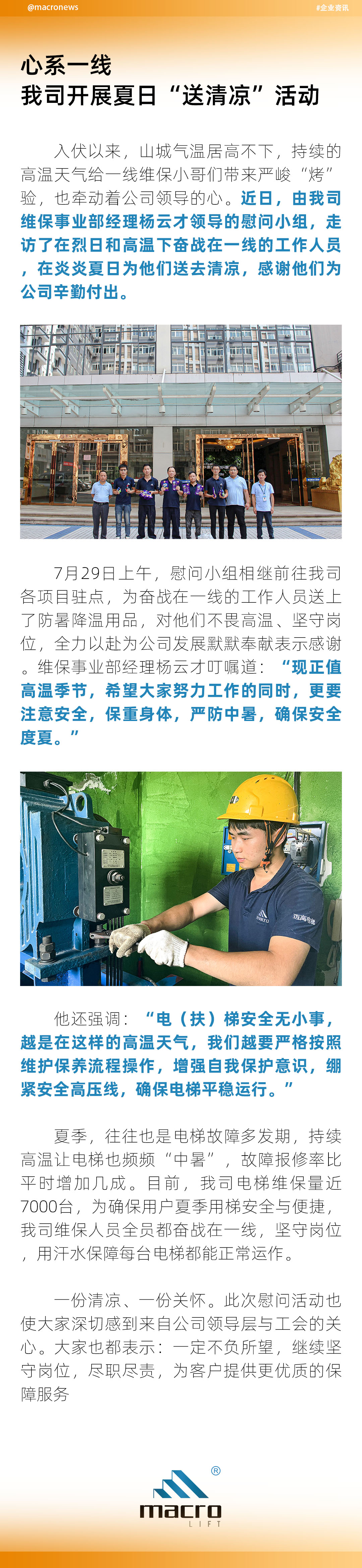 近日,由我司维保事业部经理杨云才领导的慰问小组,走访了在烈日和高温下奋战在一线的工作人员,在炎炎夏日为他们送去清凉,感谢他们为公司辛勤付出。